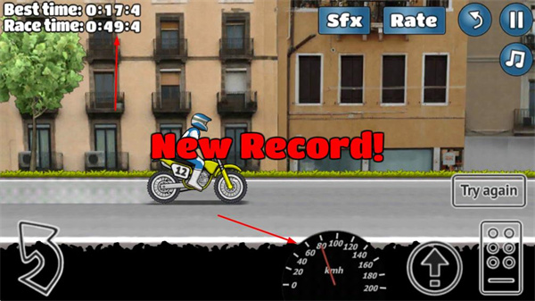 3、在競速過程中,努力創(chuàng)造新紀(jì)錄,當(dāng)屏幕顯示New Record!時(shí),說明突破了之前的最好成績,可選擇Try again再次挑戰(zhàn)。