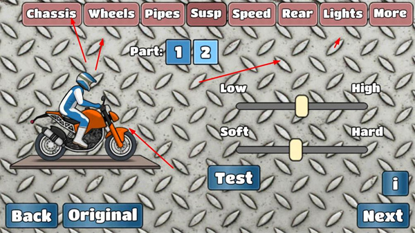 4、可對(duì)摩托車的Chassis、Wheels等部件進(jìn)行調(diào)整,設(shè)置Low、High、Soft、Hard等參數(shù),調(diào)整后點(diǎn)擊“Test”測試效果,優(yōu)化摩托車性能。