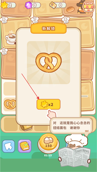 4、當(dāng)達(dá)到解鎖條件,出現(xiàn)新解鎖提示如解鎖扭結(jié)面包,點(diǎn)擊確認(rèn)領(lǐng)取獎勵,解鎖新的面包種類,繼續(xù)探索游戲內(nèi)容。