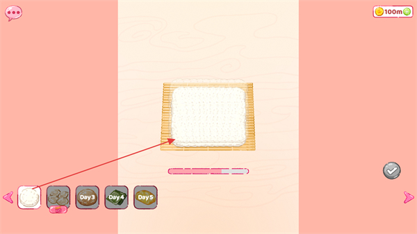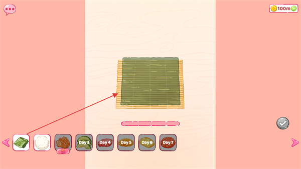 1、進(jìn)入游戲,點(diǎn)擊下方食材欄中的海苔,放置到竹簾上開始制作壽司。