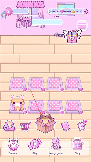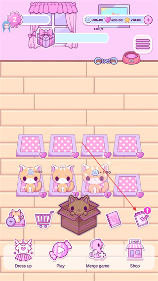 2、點擊盒子里的小貓,將其放置到粉色墊子上,增加寵物數(shù)量。
