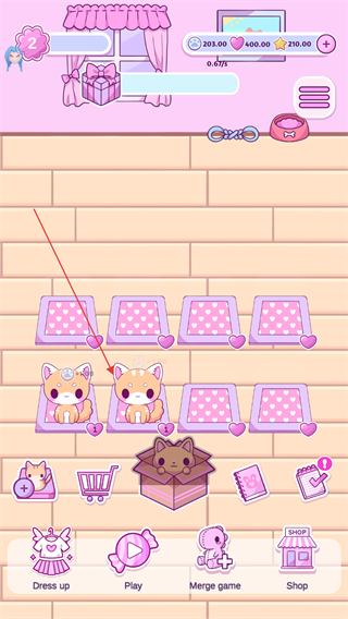 1、進入游戲界面,看到粉色溫馨場景,留意上方進度條及金錢數(shù)值203.00等。