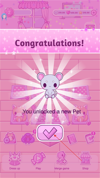 4、成功解鎖新寵物后,出現(xiàn)Congratulations!提示,點擊對勾圖標確認。
