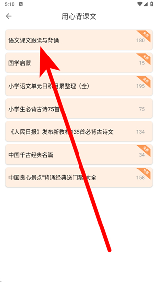 2、在用心背課文頁面,選擇語文課文跟讀與背誦。