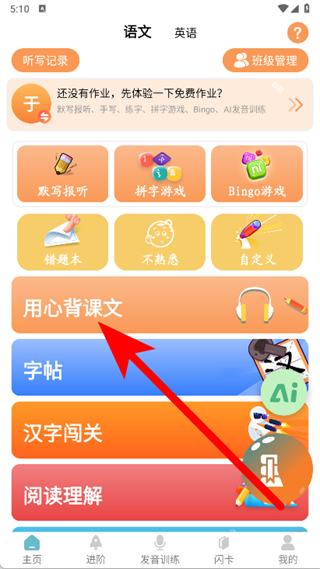 1、打開快樂聽寫APP,在主頁點(diǎn)擊用心背課文。