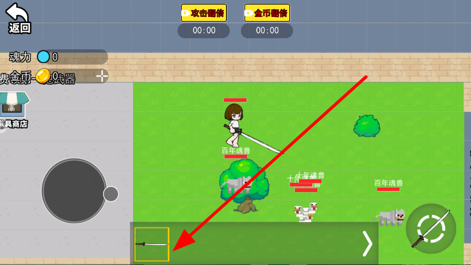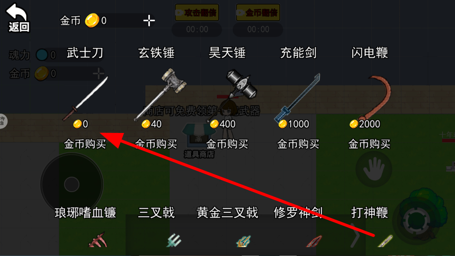 2、武器商店,有武士刀、玄鐵錘等多種武器,擁有足夠金幣時(shí),點(diǎn)擊武器進(jìn)行金幣購(gòu)買(mǎi),就能獲取該武器。