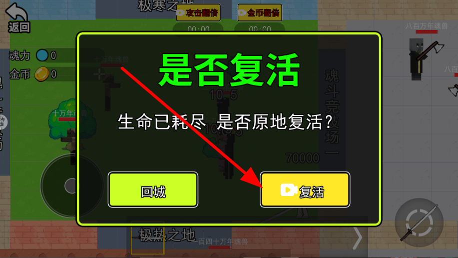 4、當(dāng)角色生命耗盡時(shí),會(huì)彈出是否復(fù)活的提示界面,此時(shí)點(diǎn)擊復(fù)活按鈕,讓角色原地復(fù)活,繼續(xù)參與戰(zhàn)斗。