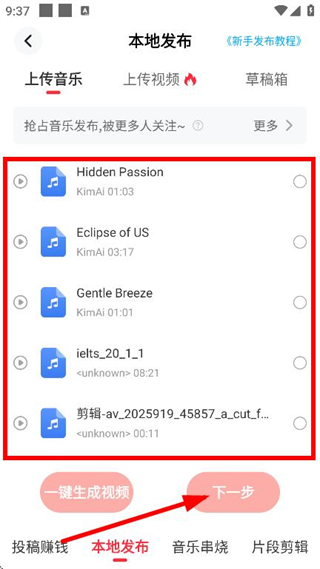 3、選擇要發(fā)布的音樂(lè),點(diǎn)擊下一步,進(jìn)入發(fā)布作品編輯頁(yè)面。