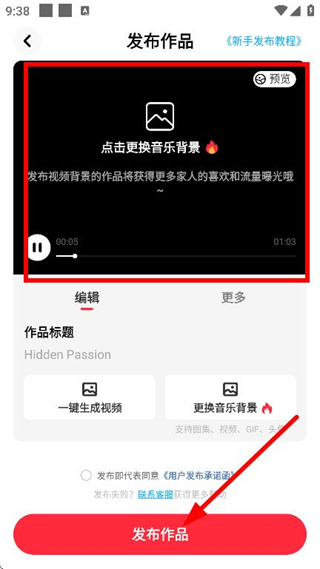4、可更換音樂(lè)背景等,確認(rèn)后點(diǎn)擊發(fā)布作品,發(fā)布作品。