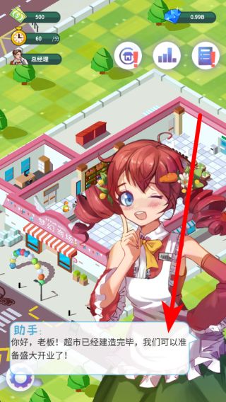 1、初始階段,會有助手引導,待超市建造完畢,即可準備開業(yè),開啟經(jīng)營之旅,此時要關注超市的基礎搭建情況,為后續(xù)運營打基礎。