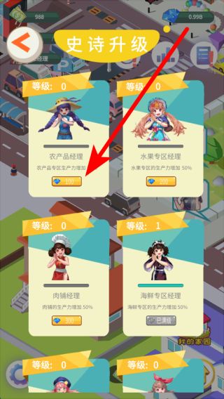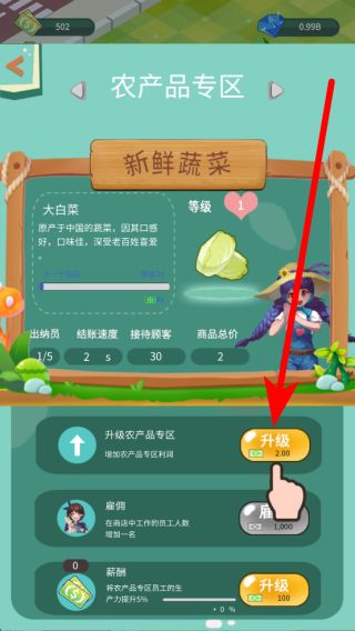 2、進入超市后,可設置不同商品專區(qū),比如農(nóng)產(chǎn)品專區(qū),像升級新鮮蔬菜類的大白菜,花費一定資金升級后,能提升商品的吸引力。