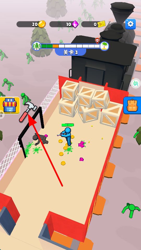 1、玩家滑動屏幕操控角色在火車車廂上移動,靈活調(diào)整位置,應(yīng)對不同方向的敵人。