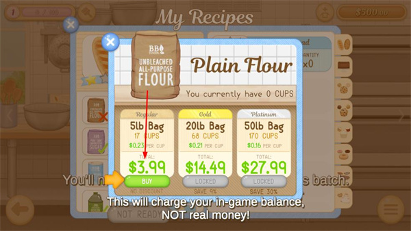 1、在食材購買界面,可選擇購買不同規(guī)格的面粉,如5lb裝的Plain Flour,花費(fèi)游戲內(nèi)貨幣即可獲得,用于后續(xù)烘焙。