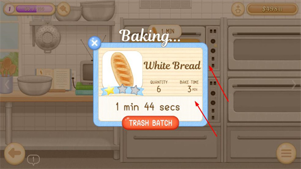 3、進(jìn)入烘焙環(huán)節(jié),制作White Bread等食品時(shí),需等待一定的烘焙時(shí)間,期間可查看剩余時(shí)間,也可選擇TRASH BATCH丟棄批次。