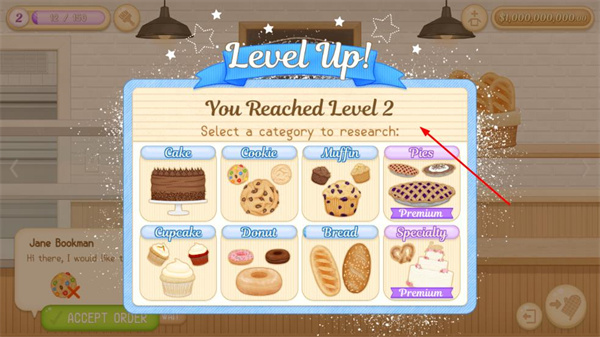 3、升級到新等級時,會出現(xiàn)Level Up!界面,可選擇Cake、Cookie等品類進行研究,解鎖更多烘焙食品。