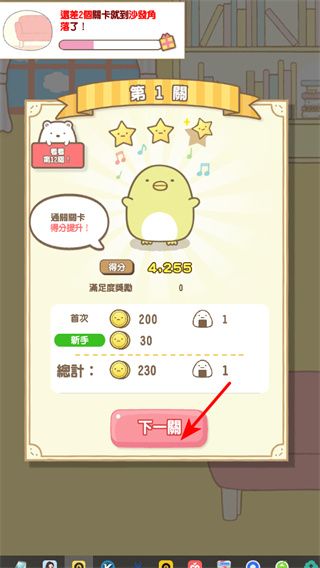 4、完成每一關(guān)的消除任務(wù),獲得分數(shù)和獎勵,點擊下一關(guān)繼續(xù),不斷積累經(jīng)驗以實現(xiàn)升級。
