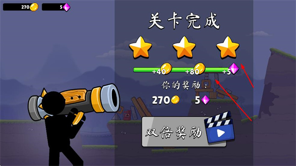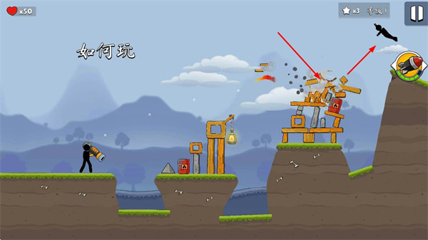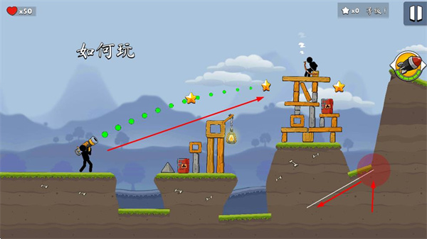 1、操控火柴人使用武器,瞄準目標建筑發(fā)射,通過調(diào)整發(fā)射角度和力度,摧毀目標建筑。