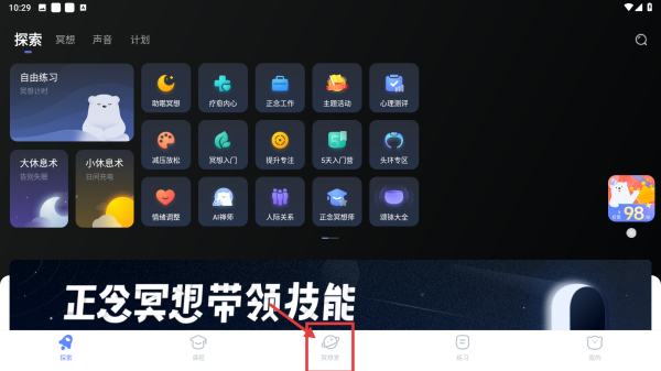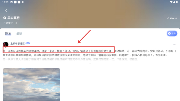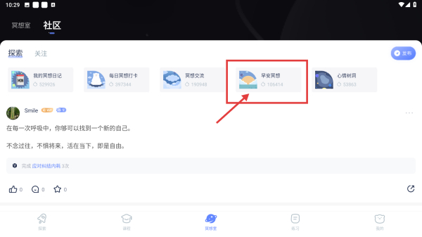 3、在社區(qū)探索區(qū),點擊早安冥想板塊,查看冥想課程及相關(guān)內(nèi)容。