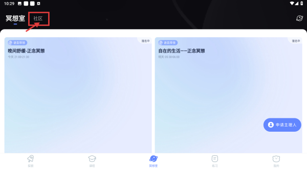 2、在冥想室頁面,點擊頂部社區(qū)選項,進(jìn)入社區(qū)板塊。