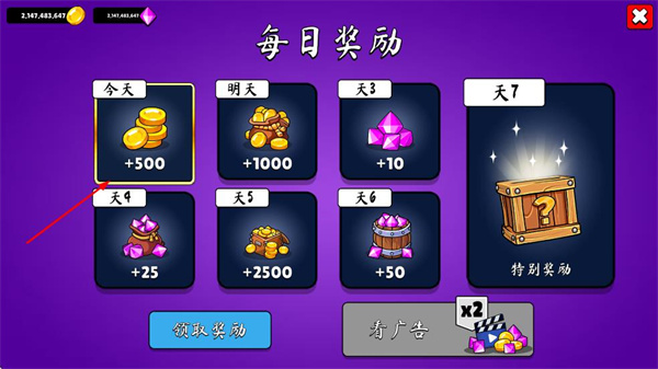 1、有每日獎(jiǎng)勵(lì)系統(tǒng),連續(xù)登錄可領(lǐng)取不同獎(jiǎng)勵(lì),如金幣、寶石,第7天還有特別獎(jiǎng)勵(lì)寶箱,可點(diǎn)擊領(lǐng)取獎(jiǎng)勵(lì)獲取。
