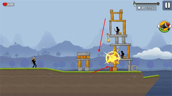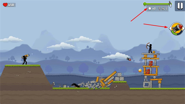 2、戰(zhàn)斗時(shí),操控火柴人用武器瞄準(zhǔn)目標(biāo)建筑發(fā)射,摧毀建筑和敵人,推進(jìn)關(guān)卡進(jìn)度,注意調(diào)整發(fā)射角度和力度。