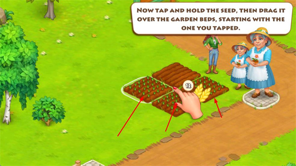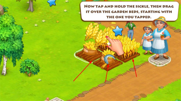 1、收割作物時,按住鐮刀并拖動,從點(diǎn)擊的那塊菜園開始,劃過菜園床完成收割。