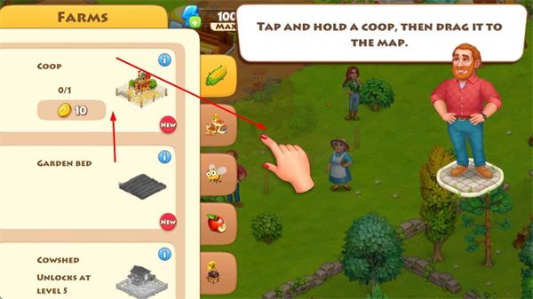 3、建造雞舍時,花費(fèi)10金幣,按住雞舍并拖動到地圖上合適位置進(jìn)行建造。