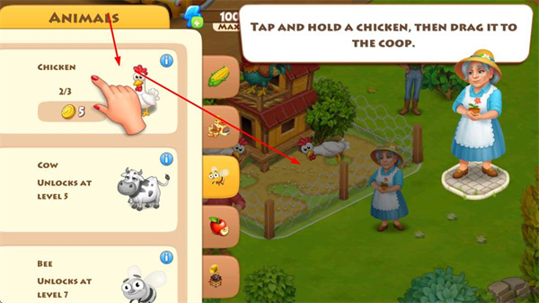 4、飼養(yǎng)動物時,比如雞,花費(fèi)5金幣,按住雞并拖動到雞舍中,還可解鎖牛、蜜蜂等其他動物進(jìn)行飼養(yǎng)。