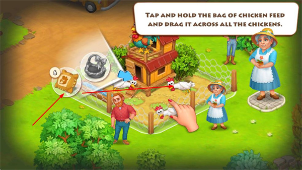 1、喂養(yǎng)雞時(shí),按住雞飼料袋并拖動(dòng),劃過所有雞,完成喂食操作。