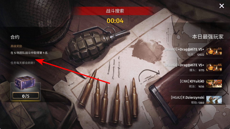 2、了解合約任務(wù),在戰(zhàn)斗搜索界面,查看合約任務(wù)如在5場團(tuán)隊?wèi)?zhàn)斗中取得第1名,明確游戲目標(biāo)。