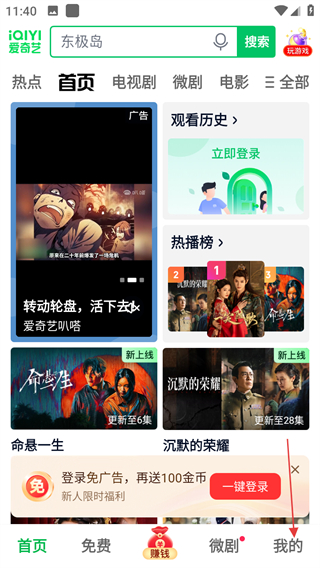 1、進(jìn)入愛奇藝首頁,點(diǎn)擊底部我的,進(jìn)入個(gè)人頁面。