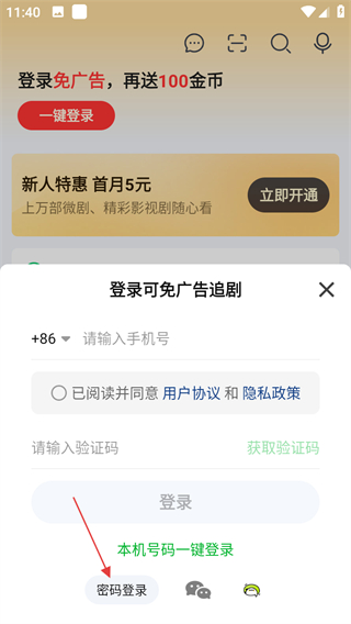 3、在登錄窗口,點(diǎn)擊密碼登錄,切換到密碼登錄界面。