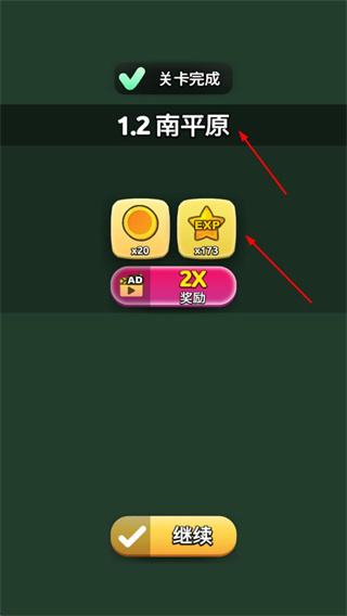 4、成功完成關(guān)卡后,會顯示關(guān)卡完成,并獲得金幣、經(jīng)驗值等獎勵,還可選擇觀看廣告獲取雙倍獎勵,之后點擊繼續(xù)進入下一個關(guān)卡。