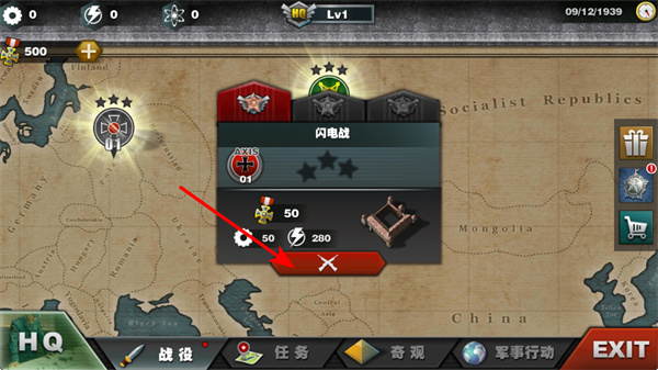1、選擇戰(zhàn)役,在戰(zhàn)役界面選擇閃電戰(zhàn)等戰(zhàn)役,查看戰(zhàn)役所需資源和獎(jiǎng)勵(lì),進(jìn)入戰(zhàn)役地圖。