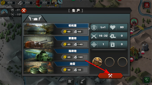 4、生產(chǎn)軍事建筑,在生產(chǎn)界面,選擇機(jī)槍堡、要塞炮等軍事建筑進(jìn)行生產(chǎn),增強(qiáng)陣地的防御能力。