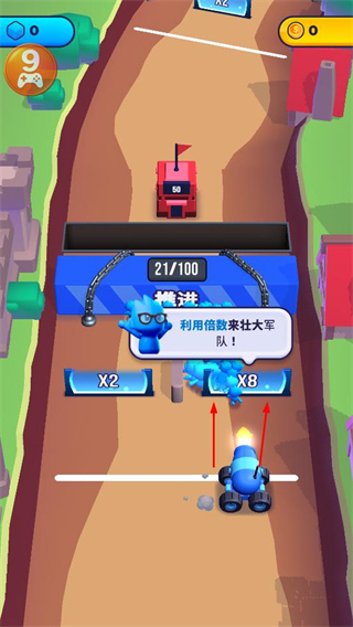 1、利用倍數(shù)功能壯大隊(duì)伍,點(diǎn)擊對(duì)應(yīng)倍數(shù)按鈕,讓藍(lán)色小人數(shù)量快速增長(zhǎng),助力推進(jìn)。