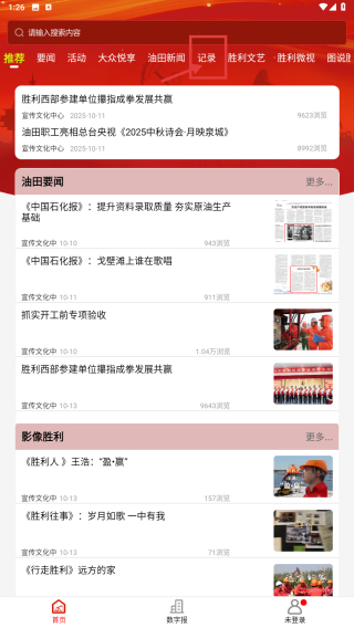 1、打開新聞類應用,點擊頂部記錄標簽,進入記錄板塊內(nèi)容頁面。