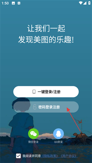 3、在登錄注冊選擇頁面,點擊密碼登錄注冊,進入賬號密碼填寫頁面。