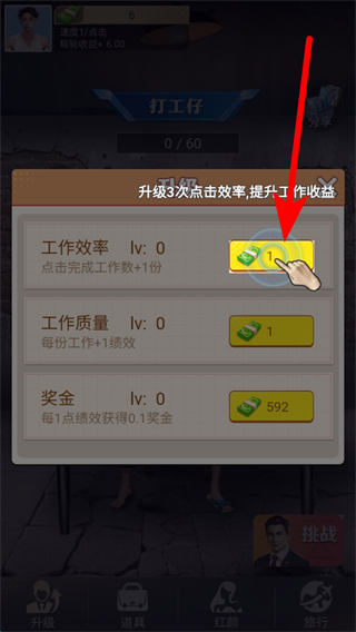 2、可升級(jí)工作相關(guān)屬性,像工作效率,升級(jí)后點(diǎn)擊完成的工作數(shù)會(huì)增加,還有工作質(zhì)量,能提升每份工作的績(jī)效,升級(jí)需消耗對(duì)應(yīng)的資源。