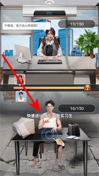 3、存在與其他角色的互動(dòng)比拼,比如和實(shí)習(xí)生比拼點(diǎn)擊速度,要快速點(diǎn)擊,戰(zhàn)勝后能獲得相應(yīng)獎(jiǎng)勵(lì),推動(dòng)角色在職場(chǎng)中進(jìn)步。