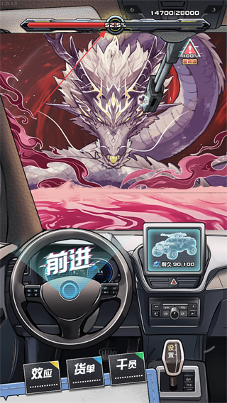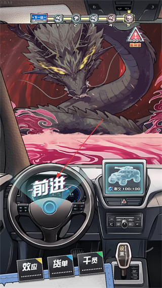 1、點擊前進按鈕開車上路,遭遇強大怪物如龍形怪物時,觀察怪物攻擊節(jié)奏。