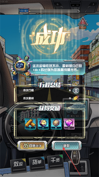4、成功抵達目的地,看到成功提示后,點擊領(lǐng)取按鈕,獲取獎勵,用于升級車輛和裝備。