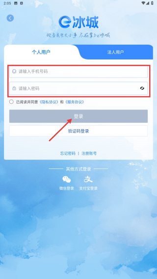 4、輸入手機(jī)號(hào)碼和密碼,勾選隱私協(xié)議和服務(wù)協(xié)議后,點(diǎn)擊登錄按鈕,完成賬號(hào)登錄。