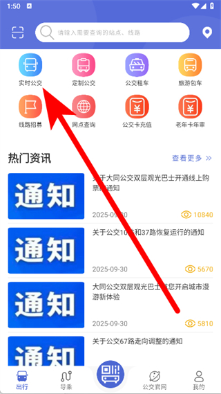 1、打開大同公交線路查詢,點(diǎn)擊實(shí)時公交。