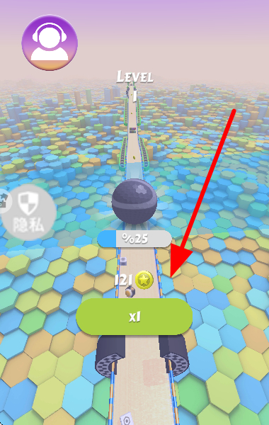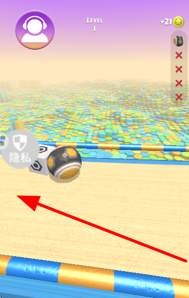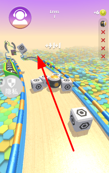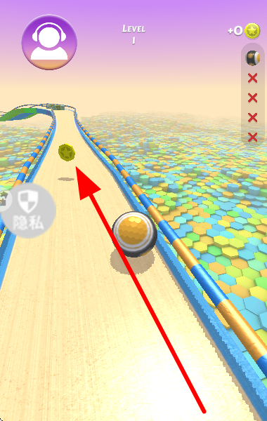 1、操控小球在賽道滾動(dòng),收集前方的金幣,賽道兩側(cè)有護(hù)欄,要控制小球別沖出護(hù)欄,收集金幣能增加分?jǐn)?shù)。