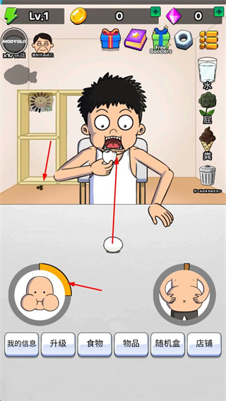 1、在游戲界面,可通過(guò)操作讓角色進(jìn)食,積累相關(guān)數(shù)值,推動(dòng)游戲進(jìn)程。