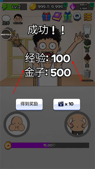 4、完成游戲目標(biāo)后,可獲得經(jīng)驗(yàn)、金幣等獎(jiǎng)勵(lì),點(diǎn)擊得到獎(jiǎng)勵(lì)領(lǐng)取,也可選擇觀看視頻獲得更多獎(jiǎng)勵(lì)。