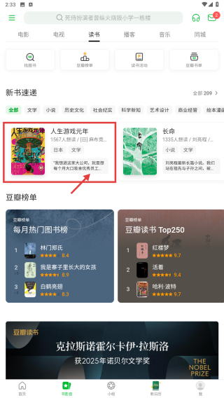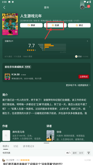 3、在讀書頻道中,找到人生游戲元年書籍條目,點(diǎn)擊進(jìn)入書籍詳情頁。