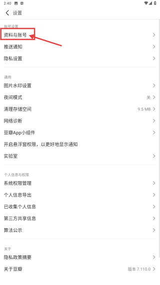 2、在設(shè)置頁(yè)面,點(diǎn)擊資料與賬號(hào)選項(xiàng),進(jìn)入賬號(hào)管理界面。