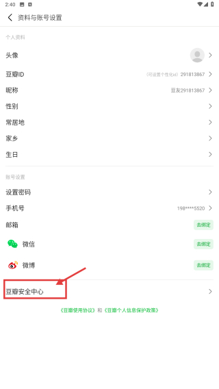 3、在賬號(hào)管理頁(yè)面,點(diǎn)擊豆瓣安全中心選項(xiàng),進(jìn)入安全中心界面。